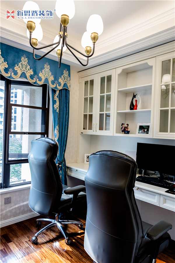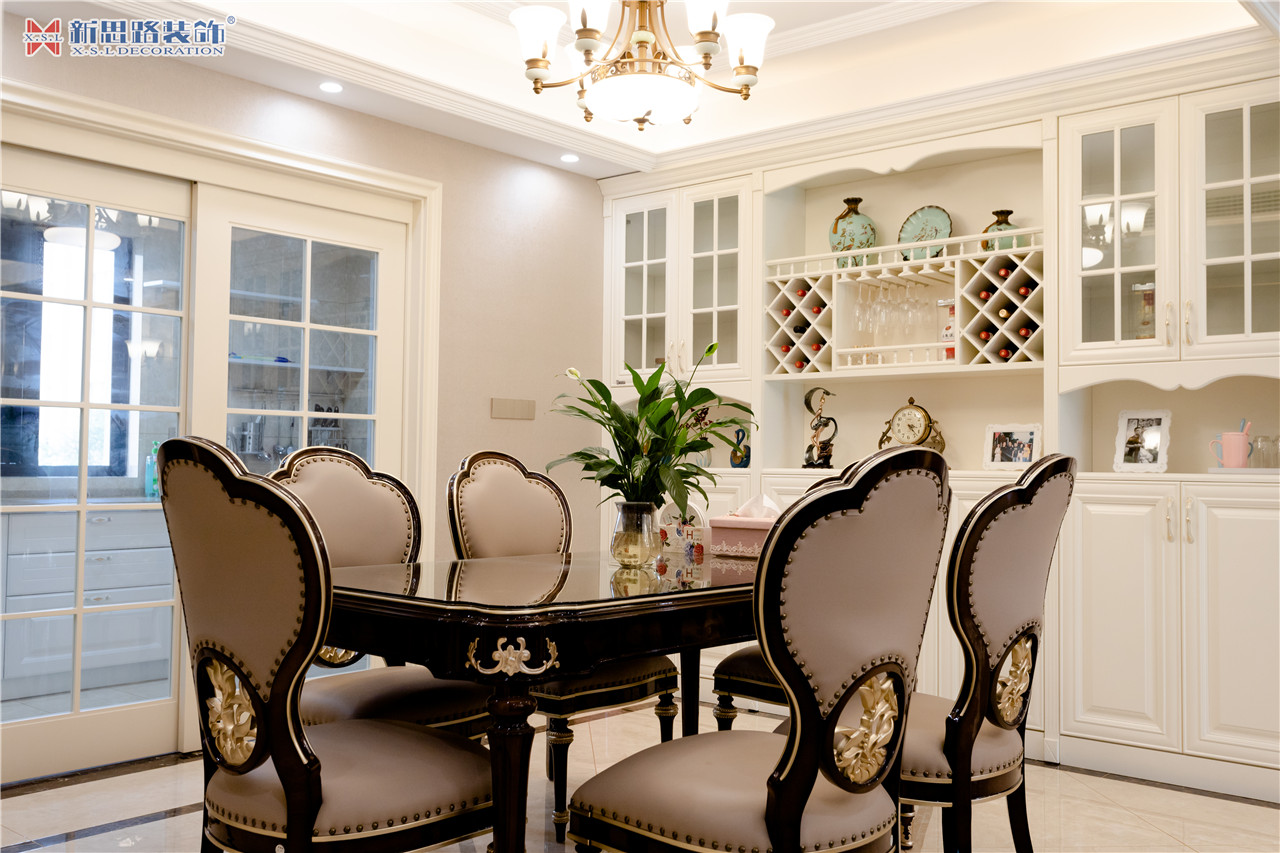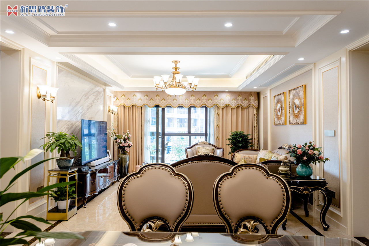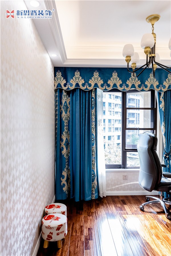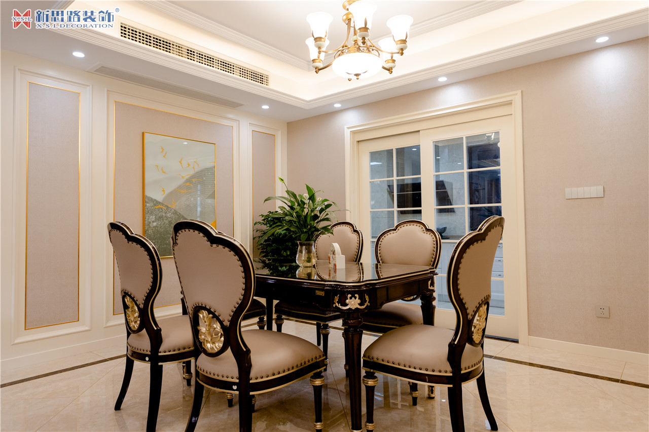 沙發(fā)背景墻使用石膏線(xiàn)材勾畫(huà)幾何圖形,古典優(yōu)雅;陶瓷的小鹿漫步花間,野趣橫生。復(fù)古花色的窗簾與真皮質(zhì)地的沙發(fā)以及實(shí)木電視柜搭配起來(lái)正合適,線(xiàn)條分割成菱形網(wǎng)格狀的乳白色電視背景墻大方低調(diào),黃銅色美式吊燈干凈明亮。深墨綠色的織錦桌旗無(wú)形中又添了點(diǎn)奢華意味,油青色的仿古裝飾擺件也是非常經(jīng)典的美式元素體現(xiàn)。