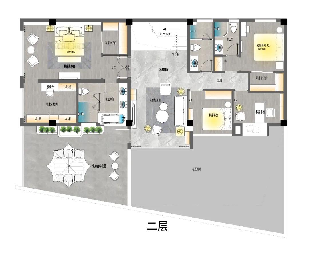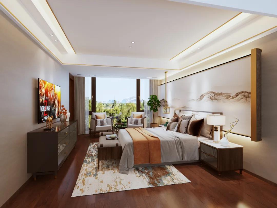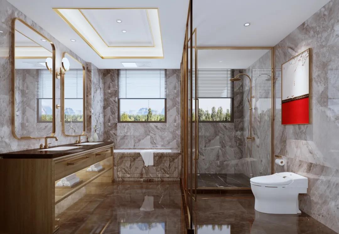 主衛(wèi)采用雙臺盆的設計,方便主人進行梳洗打扮。浴缸、淋浴間、馬桶均單獨隔開,盡可能減少衛(wèi)生間的積水情況,保持衛(wèi)生間的清潔,方便打掃,也是為了健康。除此之外,衛(wèi)生間的裝潢均采用黃銅金屬、大理石花紋,打造出奢華之感。