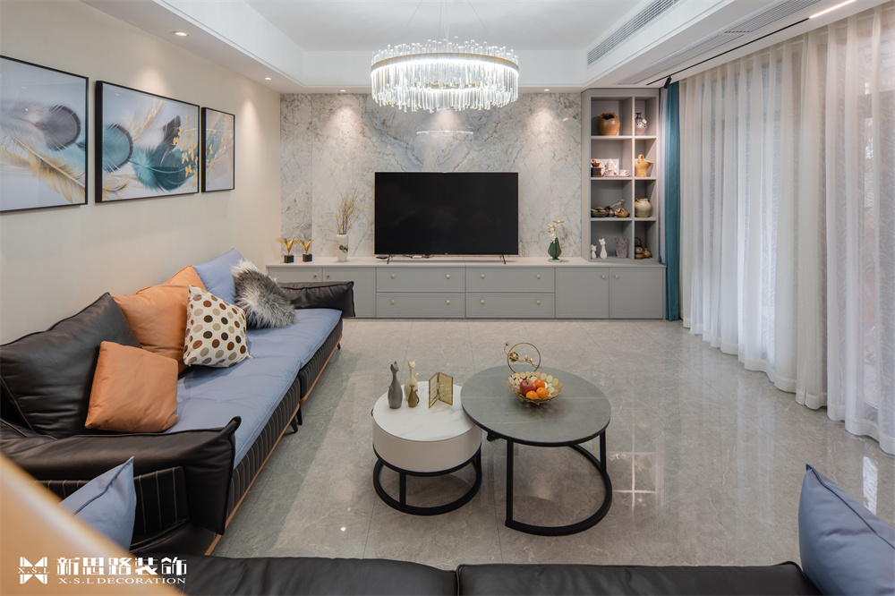 主臥的氛圍在柔和的線條中趨于平靜,皮革與布藝的使用柔化了空間的表情,讓人倍感放松。每當(dāng)清晨,光線透過(guò)窗戶傾瀉而入,家便擁有了新的心跳,每一寸空間都隨著光影的移動(dòng)而逐漸蘇醒。