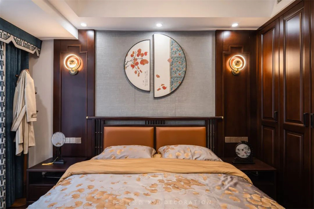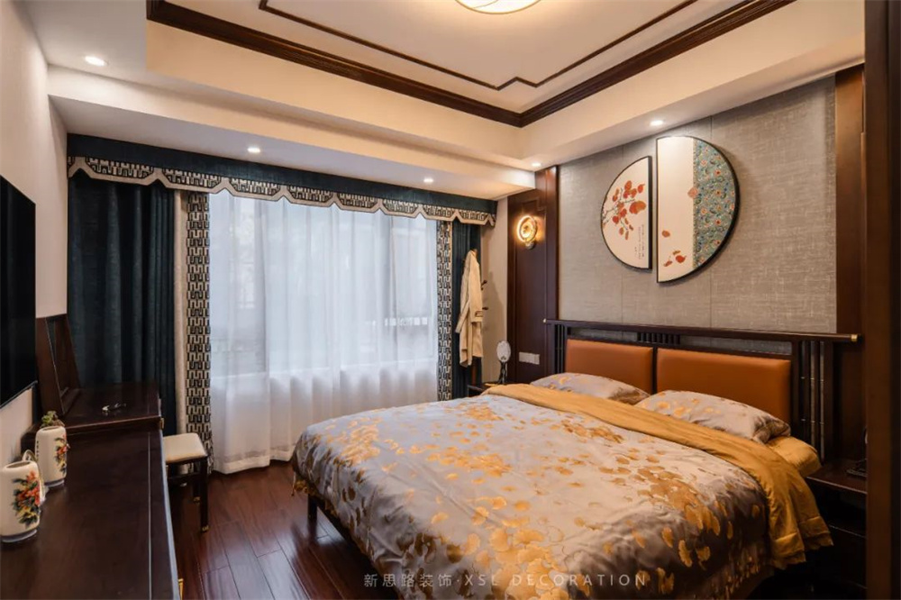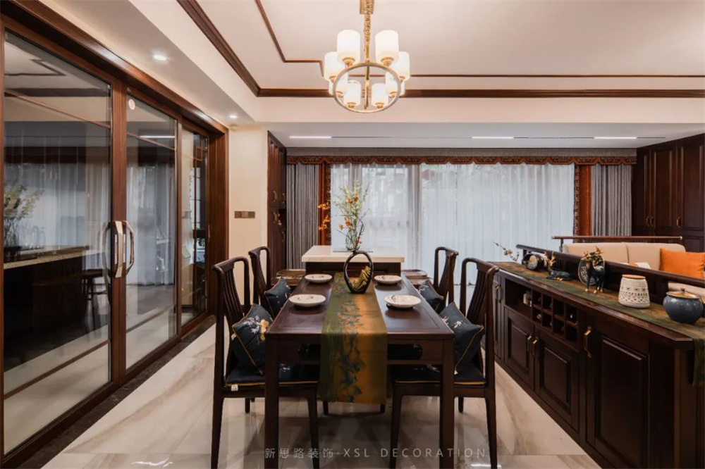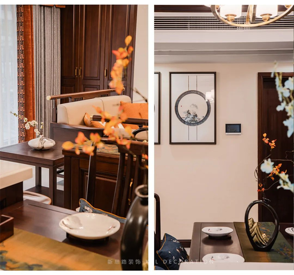 入戶(hù)玄關(guān)的視覺(jué)點(diǎn)用景和物做隔斷,半開(kāi)半合中將視線引向內(nèi)部空間,餐廳使用木色與廚房空間氛圍為一體,餐桌上采用“清明上河圖”布飾加以山水瓶插花營(yíng)造出大氣氛圍;暖色微醺的光源散漫折射照其上,撩撥平靜的心緒,蕩起一絲漣漪。明亮色彩的碰撞,傳遞中式意蘊(yùn)及趣味的同時(shí),激活味蕾的感知;絲綢布藝與盤(pán)扣的細(xì)節(jié)點(diǎn)綴,調(diào)和深木色的沉悶印象,內(nèi)斂延綿。