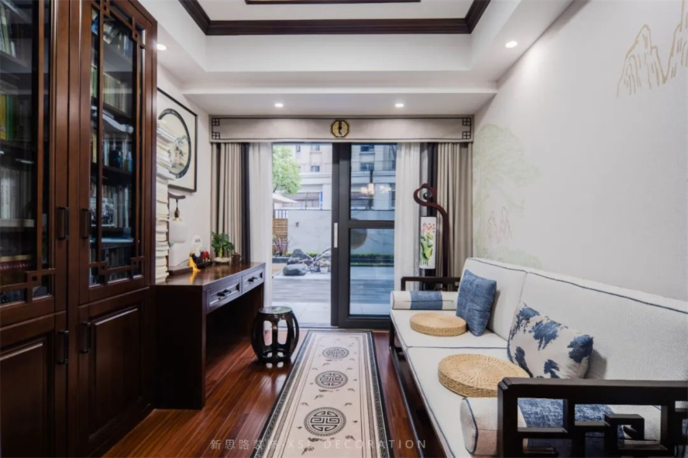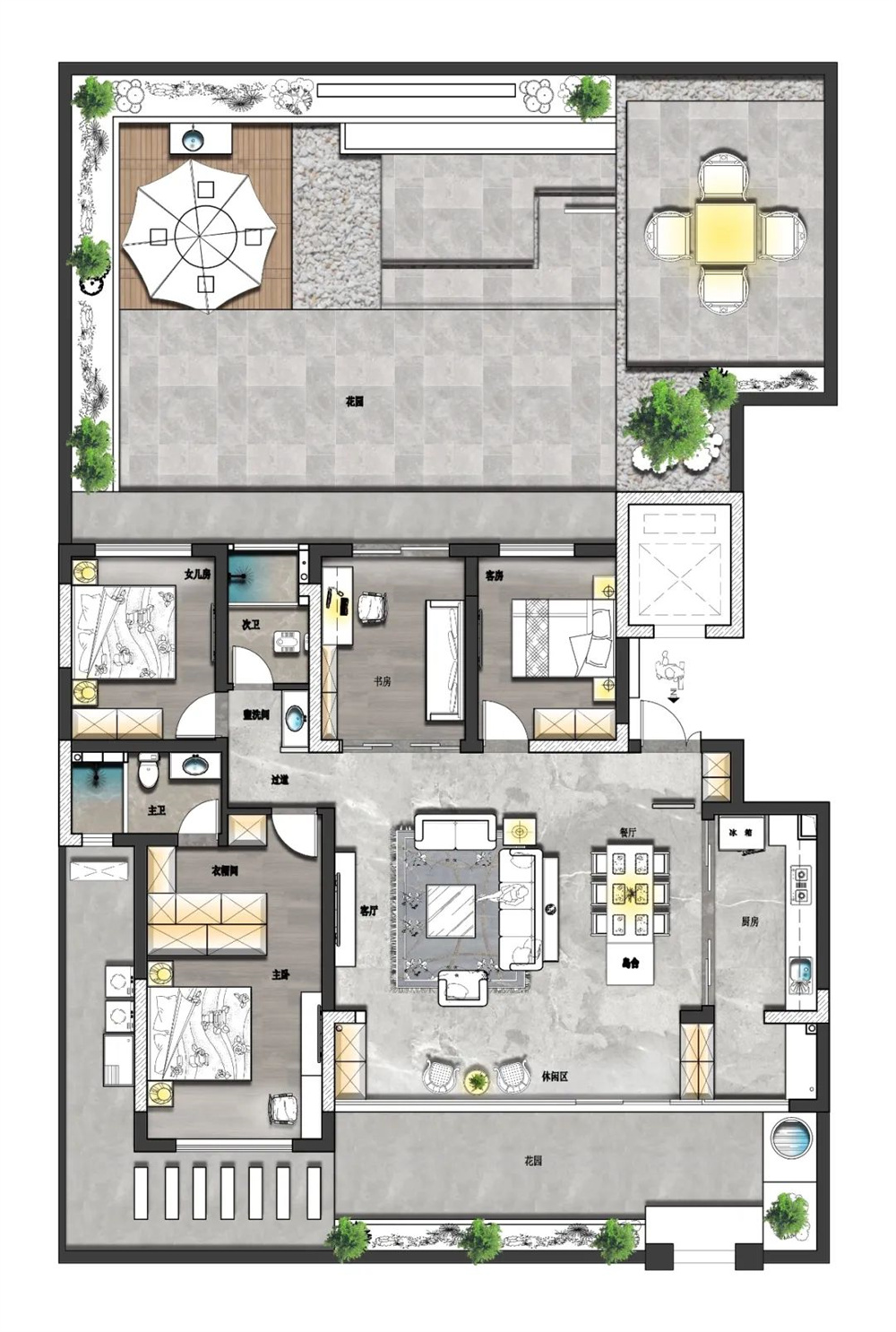 3、將臥室改為書(shū)房,書(shū)房到后花園打通做玻璃滑門(mén),更方便;書(shū)房和客廳打通做鏤空隔斷,更通透。