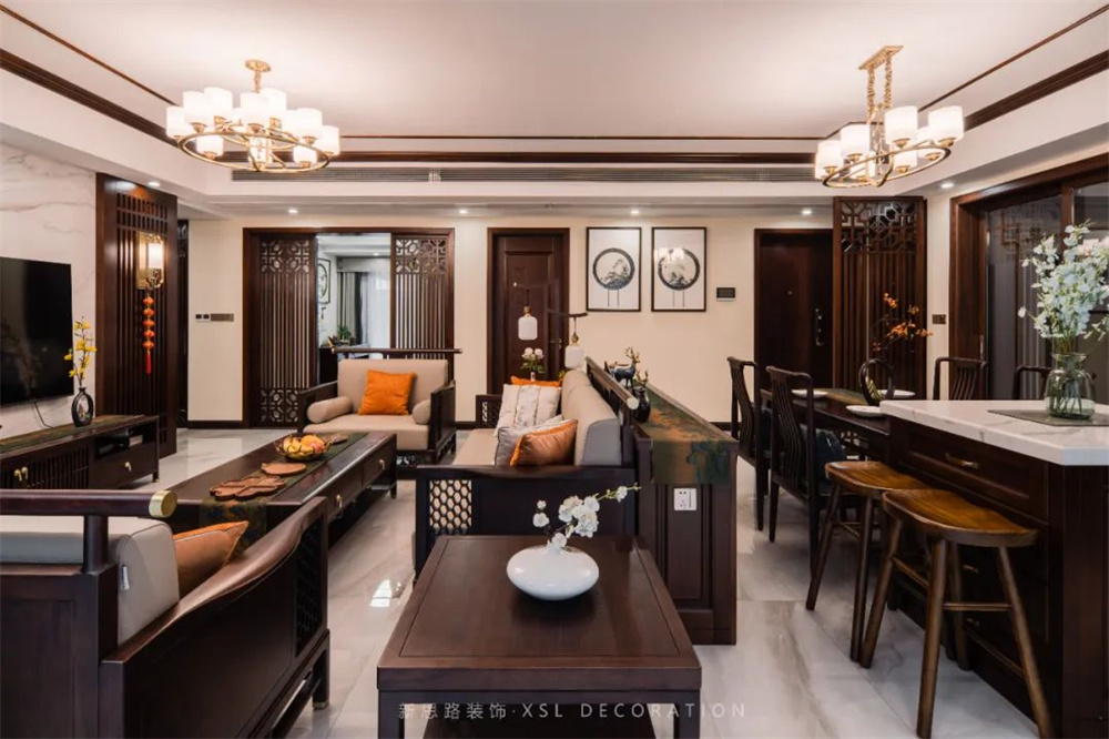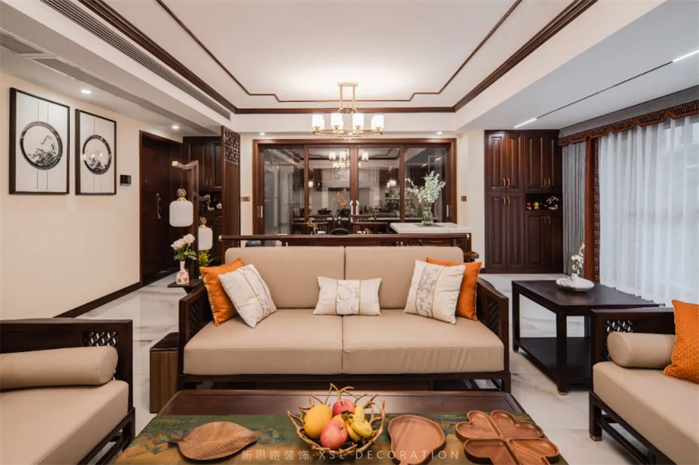 客廳空間衍脈自深厚邈遠(yuǎn)的傳統(tǒng)文化,從家具的形制、流線、色澤,到墨枝斜逸、山掩人家的山水掛畫(huà),均鐫刻著東方詩(shī)性的肌理,流露出自信大方的悠悠風(fēng)骨。融合現(xiàn)代主義的簡(jiǎn)約與傳統(tǒng)東方的形韻,令空間沾染著雅秀的氣質(zhì),清凈有格調(diào)。