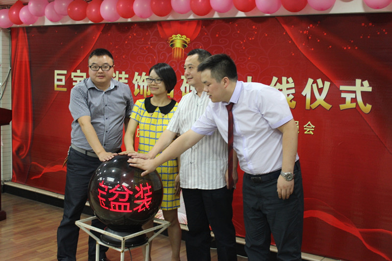 沙區(qū)經(jīng)信委李主任(右二)、巨寶盆裝飾網(wǎng)負(fù)責(zé)人、李總(左一)共同啟動水晶球