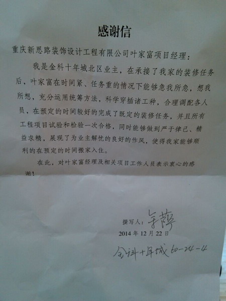 12月22日下午,新思路裝飾江北店收到了金科十年城業(yè)主余老師親自送來(lái)一封感謝信。信里洋溢著她對(duì)公司及葉家富工長(zhǎng)的贊美和感謝之情,也讓我們感受到了來(lái)自冬日里的一抹溫暖和感動(dòng)。