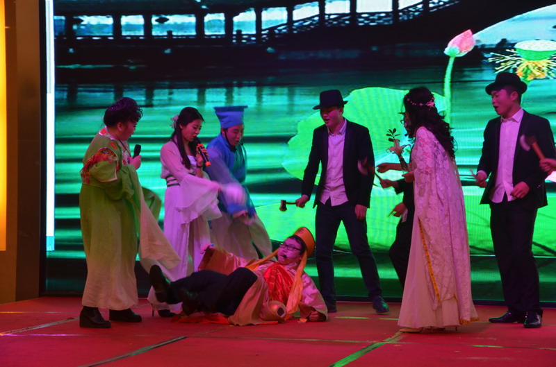 接下來(lái)的節(jié)目演出立刻讓晚會(huì)現(xiàn)場(chǎng)成為歡樂(lè)的殿堂。歌曲、舞蹈、小品、合唱多種節(jié)目形式,精彩紛呈,所有節(jié)目均為公司員工自編、自導(dǎo)、自演,充分反映出新思路裝飾生動(dòng)而富有內(nèi)涵的企業(yè)文化。繽彩紛呈、風(fēng)格各異的十幾個(gè)節(jié)目贏得觀眾滿堂喝彩,充分展現(xiàn)出新思路家人多才多藝、能歌善舞的一面。熱鬧喜慶的《拜新年》作為開(kāi)場(chǎng)第一個(gè)節(jié)目閃亮登場(chǎng),歡快的舞蹈、喜慶的旋律、愉悅的氛圍感染著每一位在場(chǎng)的觀眾,為整場(chǎng)晚會(huì)點(diǎn)燃激情?;盍Ρ挤诺拇疅璧浮缎√O(píng)果》引起現(xiàn)場(chǎng)尖叫聲不斷;工程部家人帶來(lái)的歌曲《超越夢(mèng)想》以大合唱的形式唱響了新思路人超越夢(mèng)想、勇攀高峰的激情和心聲;性感柔美的歌伴舞《萬(wàn)水千山總是情》更是引得場(chǎng)下“粉絲”陣陣尖叫。要說(shuō)全場(chǎng)最閃亮的舞蹈,當(dāng)屬才女徐藝丹帶來(lái)的獨(dú)舞《映山紅》,優(yōu)美的舞姿訴說(shuō)著無(wú)盡的情思,散發(fā)著醉人的芳香,看得人是如癡如醉。而江北店家人帶來(lái)的小品《招聘》延續(xù)去年的爆笑風(fēng)格,幽默的臺(tái)詞,惟妙惟肖的模仿讓現(xiàn)場(chǎng)笑聲連連,掌聲不斷。還有南坪店家人表演的小品《新白娘子傳奇》、工程部家人帶來(lái)的情景劇《交房》、沙坪壩店家人帶來(lái)的對(duì)唱《有你有我》、江北店家人表演的相聲《回家》......家人們以業(yè)余的身份發(fā)揮出了專(zhuān)業(yè)演員的水平,把角色演繹得惟妙惟肖,讓人嘆為觀止。