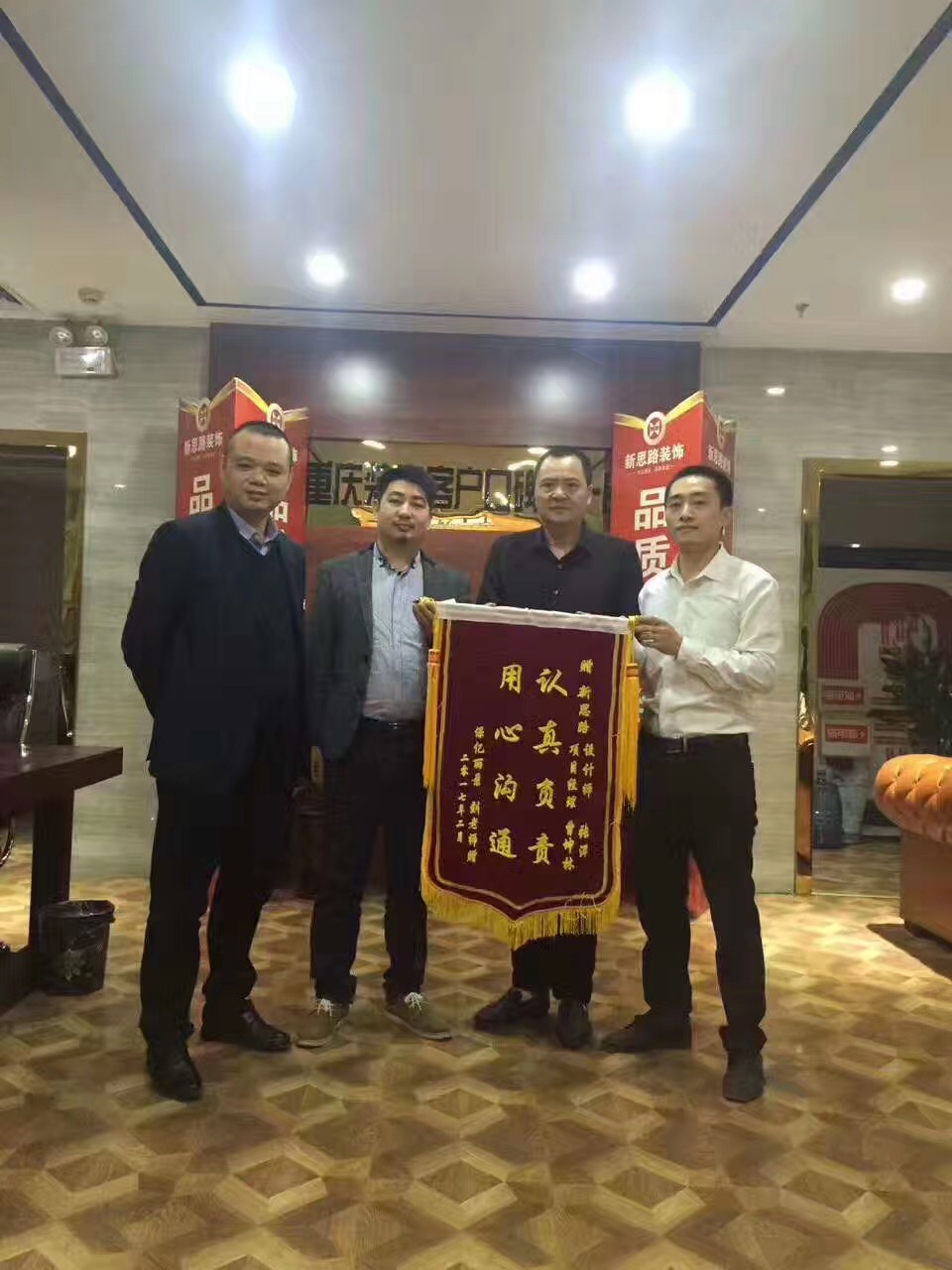 4月1日,來自保億麗景紫園的業(yè)主劉老師將一面印有“認(rèn)真負(fù)責(zé),用心溝通”的大紅錦旗交到渝北店雷店長(zhǎng)手中,以感謝新思路裝飾高品質(zhì)的裝修質(zhì)量和服務(wù)水平。