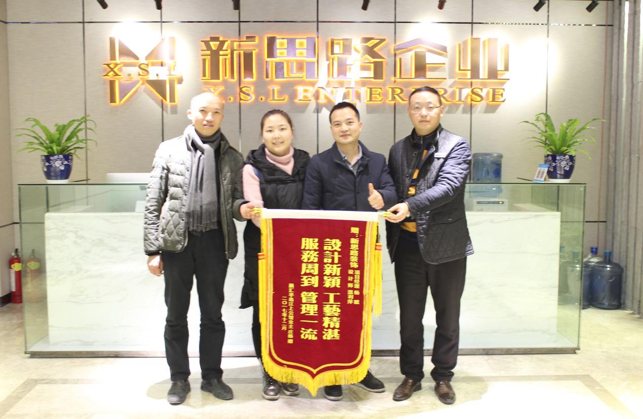 喜上眉梢——2018年的第一面錦旗 1月5日下午,來自融匯半島江上公館的業(yè)主夫婦莊老師和騰老師專程來到新思路裝飾南坪店,送上一面寫有“設(shè)計新穎、工藝精湛、、服務(wù)周到、管理一流”的大紅錦旗,以感謝新思路裝飾一流的設(shè)計方案和裝修質(zhì)量。