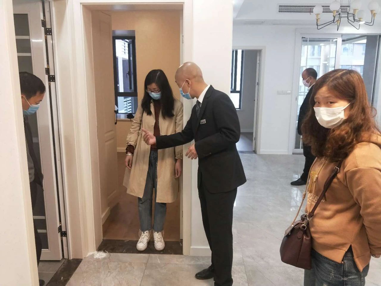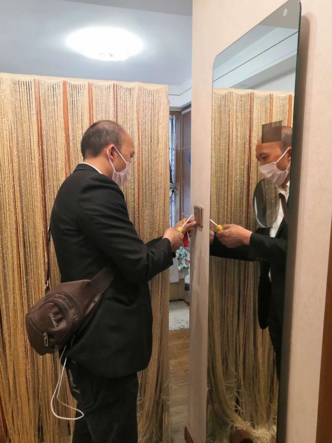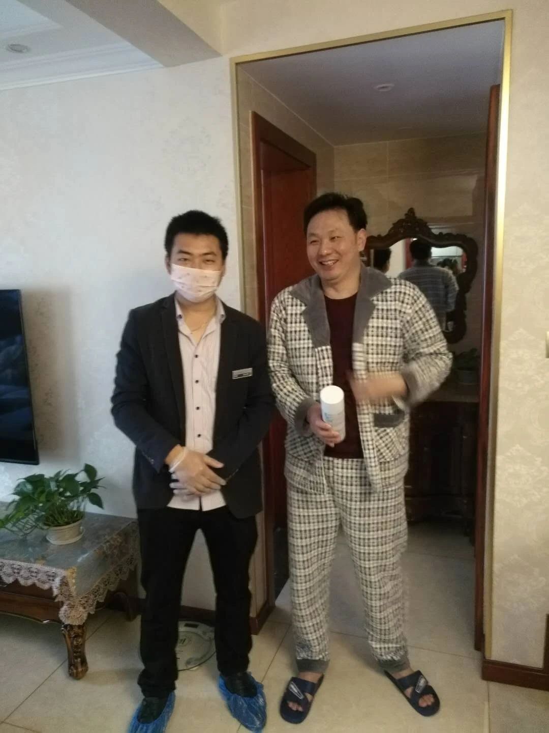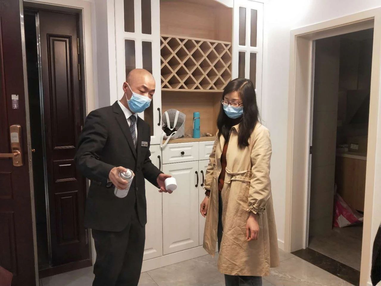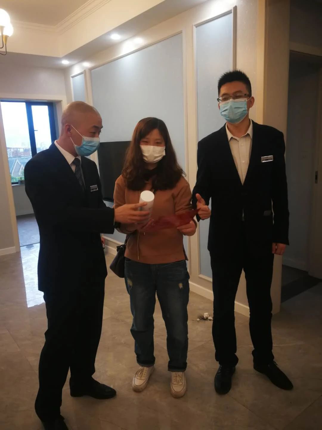 ▲工程部回訪專員為業(yè)主贈送酒精消毒液
