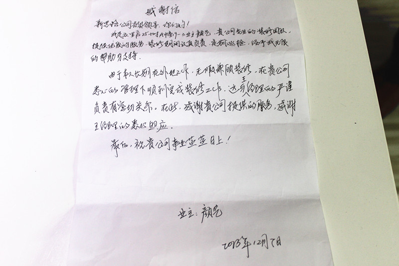 顏老師在信中表示:“由于本人長(zhǎng)期在外地工作,無(wú)暇兼顧裝修,在貴公司的悉心管理下順利完成裝修工作。貴公司專業(yè)的裝修團(tuán)隊(duì),提供優(yōu)質(zhì)的服務(wù),裝修期間王經(jīng)理認(rèn)真負(fù)責(zé),質(zhì)檢定期巡查工地,保證了工程質(zhì)量。在此,感謝貴公司提供的裝修服務(wù),感謝王經(jīng)理的細(xì)心照應(yīng)。”