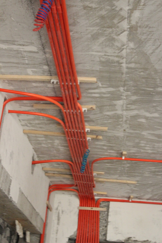 文經(jīng)理正在向項(xiàng)目經(jīng)理講解強(qiáng)電線路施工要求