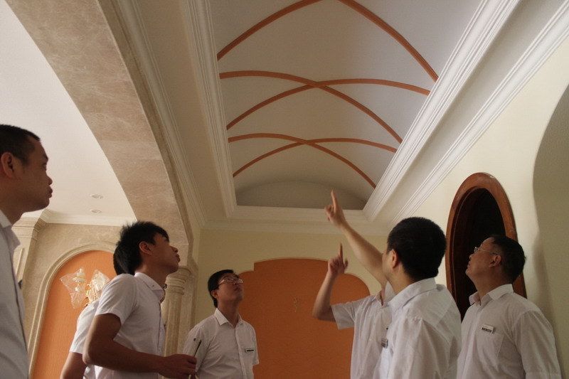 在雅居樂39-2工地。該別墅設(shè)計師——南坪店楊店長向大家詳細講解了電視墻、頂面造型的設(shè)計技巧以及相關(guān)材料的使用等知識。大家也依據(jù)自身所學和相關(guān)施工經(jīng)驗,大膽提出自己的設(shè)計見解。工地大巡查不光確保了工程品質(zhì),同樣也拓寬了設(shè)計視野,為提升各店設(shè)計實力打下了堅實的基礎(chǔ)。