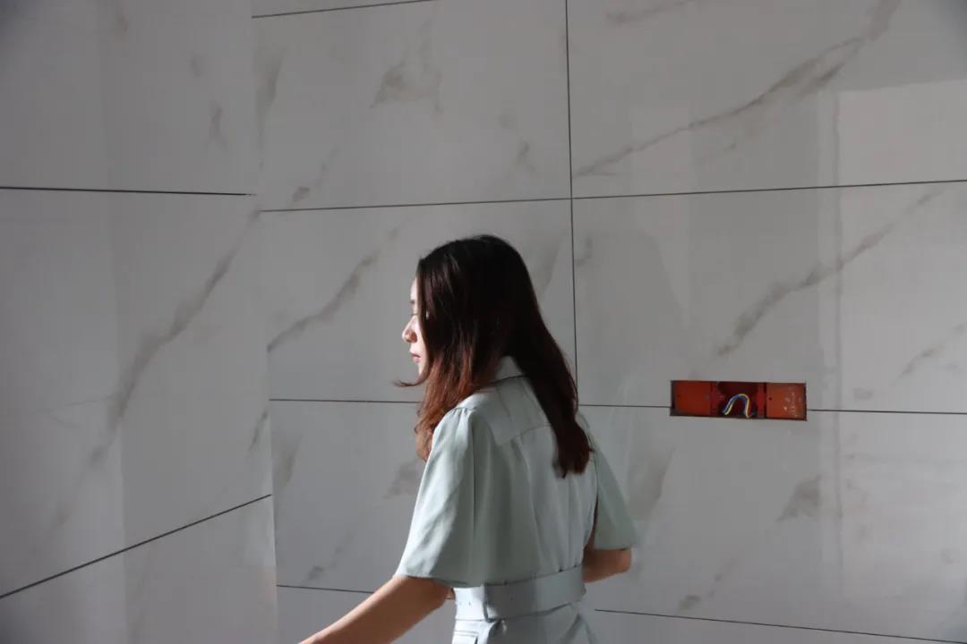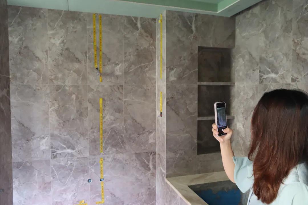 這處工地正在進行硬裝階段,我們的工人師傅正在工地上進行貼磚的工作。設計師陳薇仔細檢查墻面的瓷磚接縫是否符合我們的工程要求,再與工人師傅一起交流了一些工地上的問題,了解到目前的工程進度。