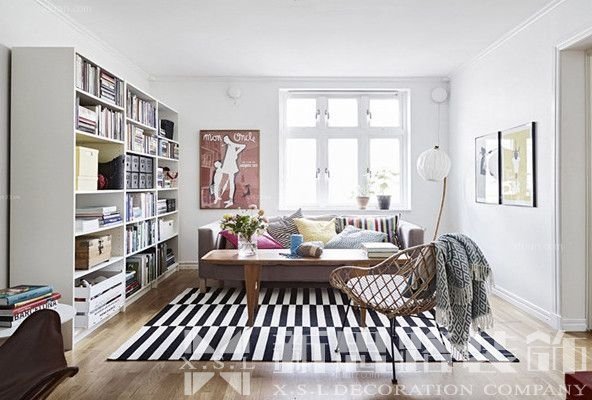 黑白兩色的搭配是配色中最常用的,同時也是北歐風(fēng)格中經(jīng)常會使用到的顏色。以上面北歐風(fēng)格沙發(fā)、一個藤條的躺椅使整個房間氣氛看起來輕松、自由,十分簡單的桌子設(shè)計和純白色家具的書架以及一個白色造型優(yōu)美的臺燈,讓人感覺整潔明亮。其中最亮眼的就當(dāng)屬北歐客廳地毯的鋪設(shè),黑白條紋給人視覺上的交錯感,光看就感覺踩上去會很舒服,同時帶點小時尚感。