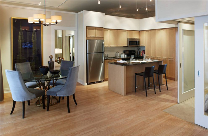 2:選用易潔材料。餐廳和客廳的墻面、地面應(yīng)與廚房一樣選用容易清潔的材料,地面最好選用地磚、強(qiáng)化地板等材料,切忌鋪貼實(shí)木地板,因?yàn)閷?shí)木地板容易受熱氣影響產(chǎn)生變形,縫隙間也容易沾上油污。